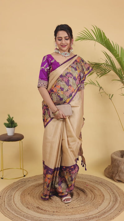 A graceful blend of heritage-inspired design and modern elegance. This saree brings the timeless charm of Kalamkari motifs into a contemporary form through vibrant digital prints. The beautifully illustrated pallu and borders create a bold visual statement, while the soft neutral body keeps the look balanced and sophisticated. Perfect for women who love tradition styled with confidence and flair.