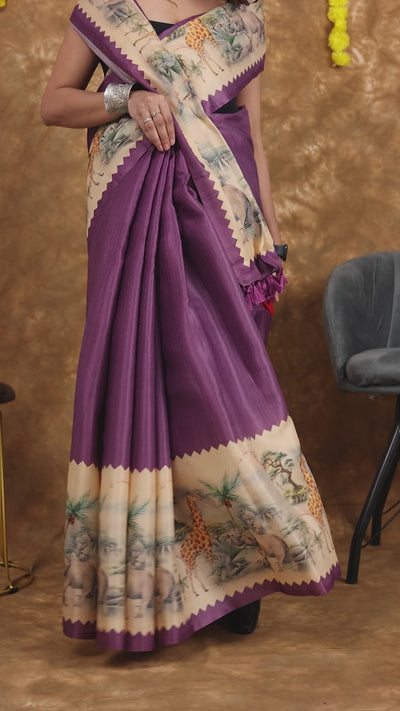 A bold yet graceful saree designed for women who love to stand out. The deep jamuni-purple body creates a rich base, while the digitally printed wildlife pallu brings in artistic storytelling. This saree transforms tradition into a contemporary style statement – perfect for those who enjoy mixing elegance with attitude.
